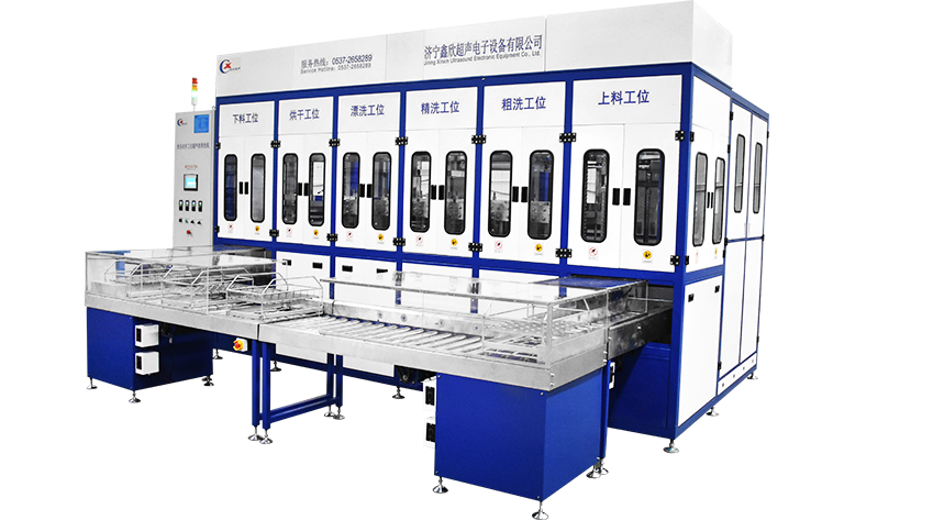 該設備有上下料網帶、超聲波清洗工位、噴淋漂洗工位、高壓風切、熱風烘干工位、溫控水加熱系統、風機、溫控空氣加熱系統、移動式風刀、PLC+觸摸屏控制系統、管路系統及智能電器控制系統等組成。自動進排液和自動